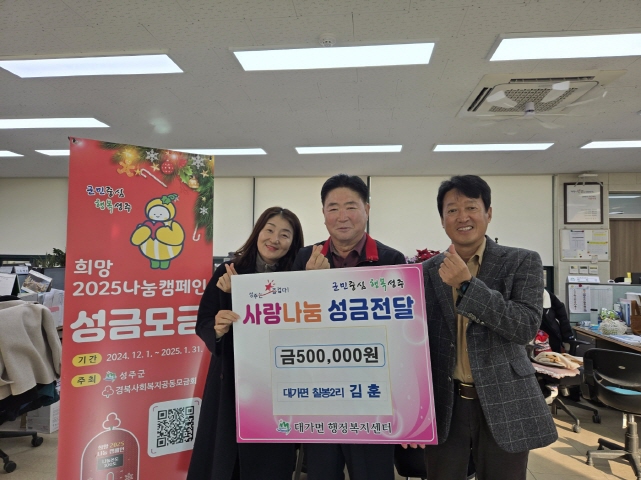 성주 대가면 칠봉2리 김훈 대표 희망2025 나눔캠페인 성금 기탁![]() 【경상포커스=전상철기자】성주군 대가면 칠봉2리 김훈 대표는 11일 대가면행정복지센터를 방문해 희망2025나눔캠페인에 성금 50만원을 기탁했다.