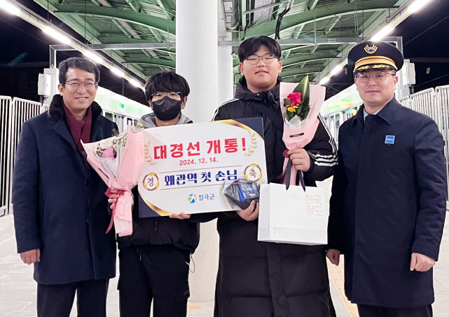 이상종 칠곡군 교통행정과장과 윤창열 왜관역장은 최초로 대경선 왜관역을 이용한 학생들에게 기념품을 전달하며 축하 인사를 건넸다.