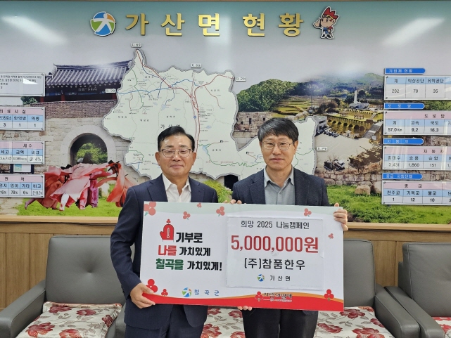 【경상포커스=김경희기자】칠곡군 가산면 (주)참품한우(대표 정상태)는 20일 2025년 이웃돕기 성금 500만원을 가산면에 기탁했다.