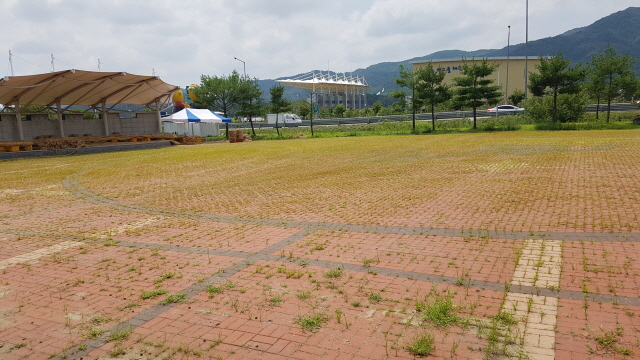 【경상포커스=박동석기자】28일 성주군 농업기술센터 앞 운동장. 무성하게 자란 잡초로 뒤덮인 이곳은 군민들의 심신을 단련하는 운동장이 아니라 휴경중인 풀밭으로 보인다.